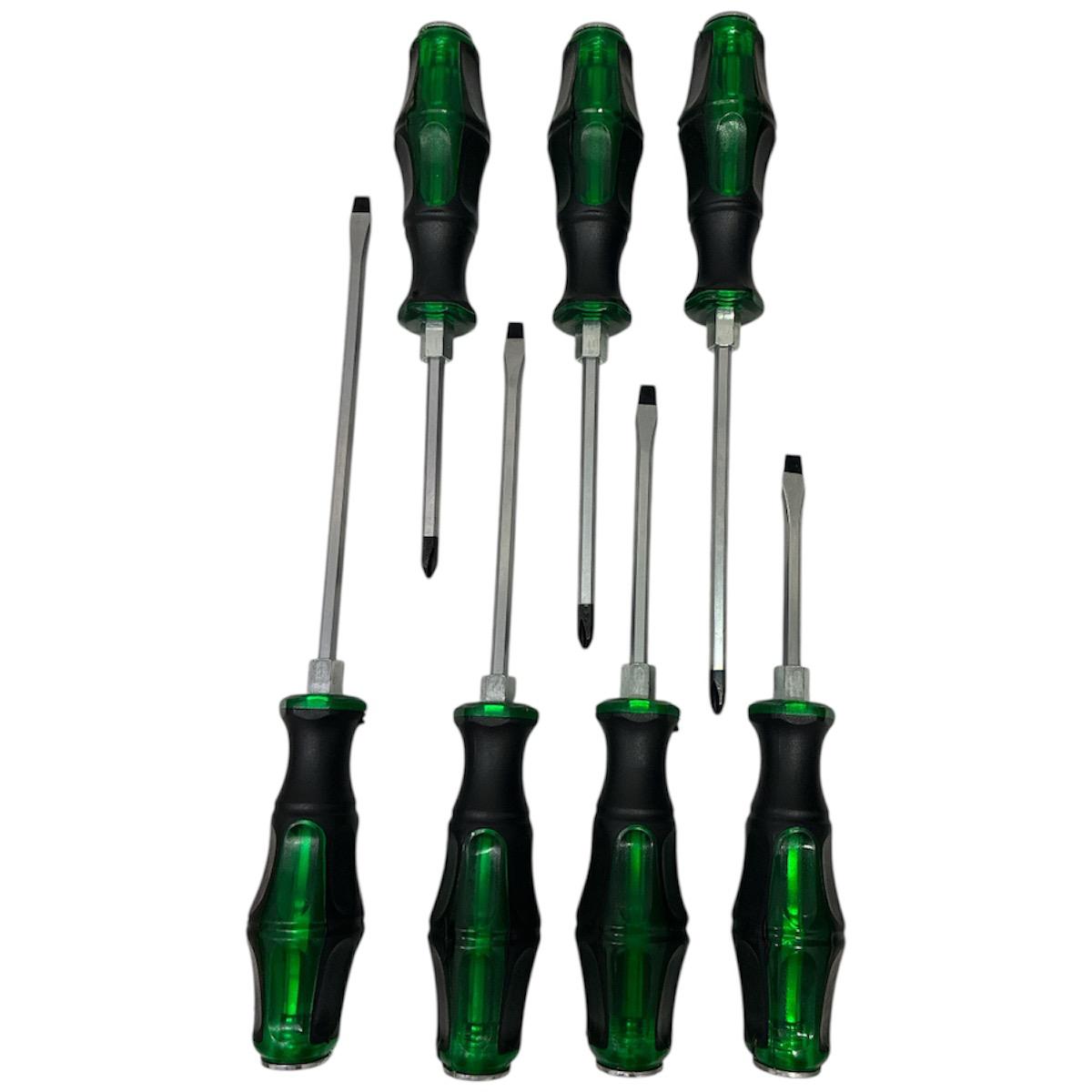 Juego de 7 destornilladores para uso extremo, le puedes golpear con Martillo en la parte superior del mango para aflojar tornillos apretados, también puedes utilizar una llave de 11 Milímetros o de 7/16" para que le puedas hacer "palanca" y por tanto mayor fuerza. Su punta imantada es ideal para evitar que los tornillos se caigan.