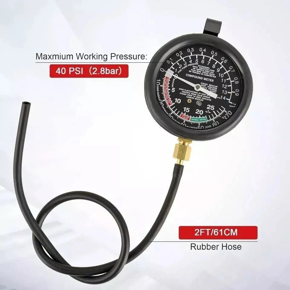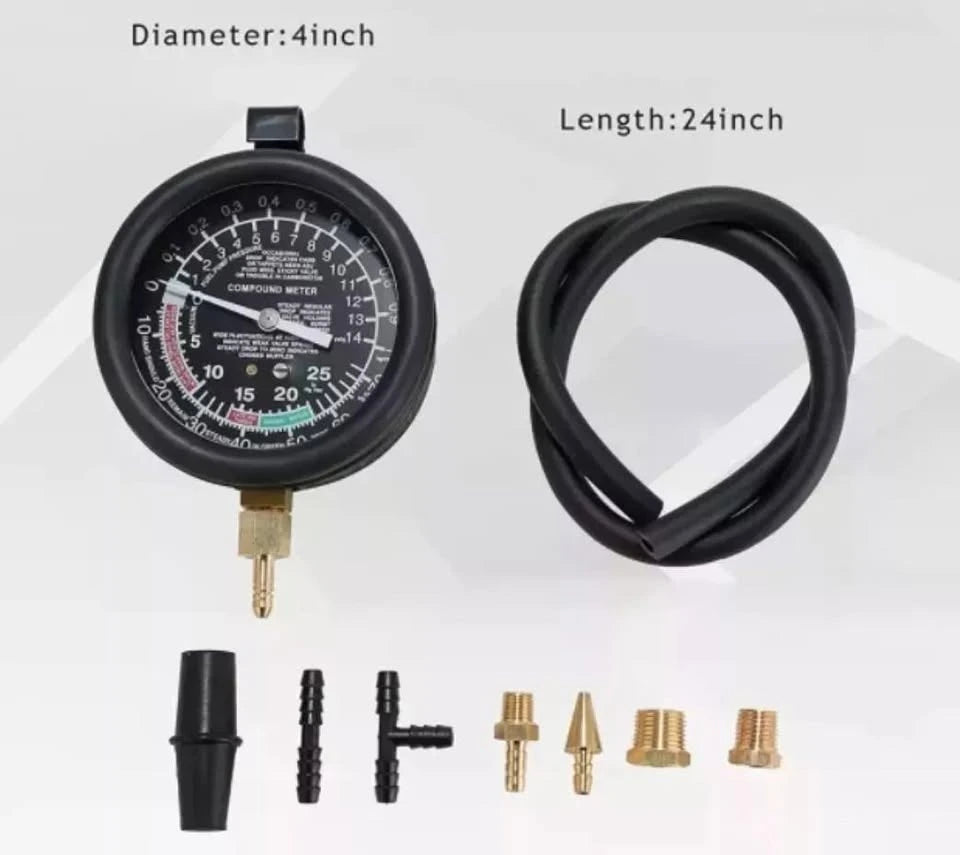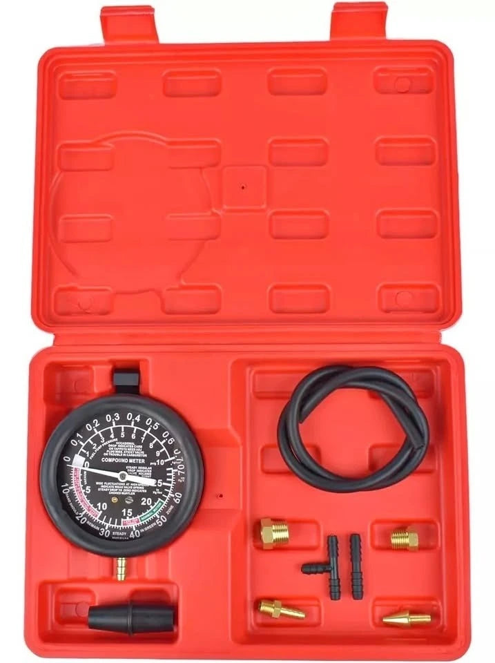 Este vacuómetro automotriz sirve para medir el vacío creado por el motor y diagnosticar el estado de los sistemas de combustible y admisión de un vehículo. Este instrumento permite a los mecánicos evaluar si el motor está funcionando correctamente y detectar posibles fugas en el sistema de admisión de aire. Además, el vacuómetro muestra los resultados en una escala de lectura, lo que facilita la interpretación de los datos.